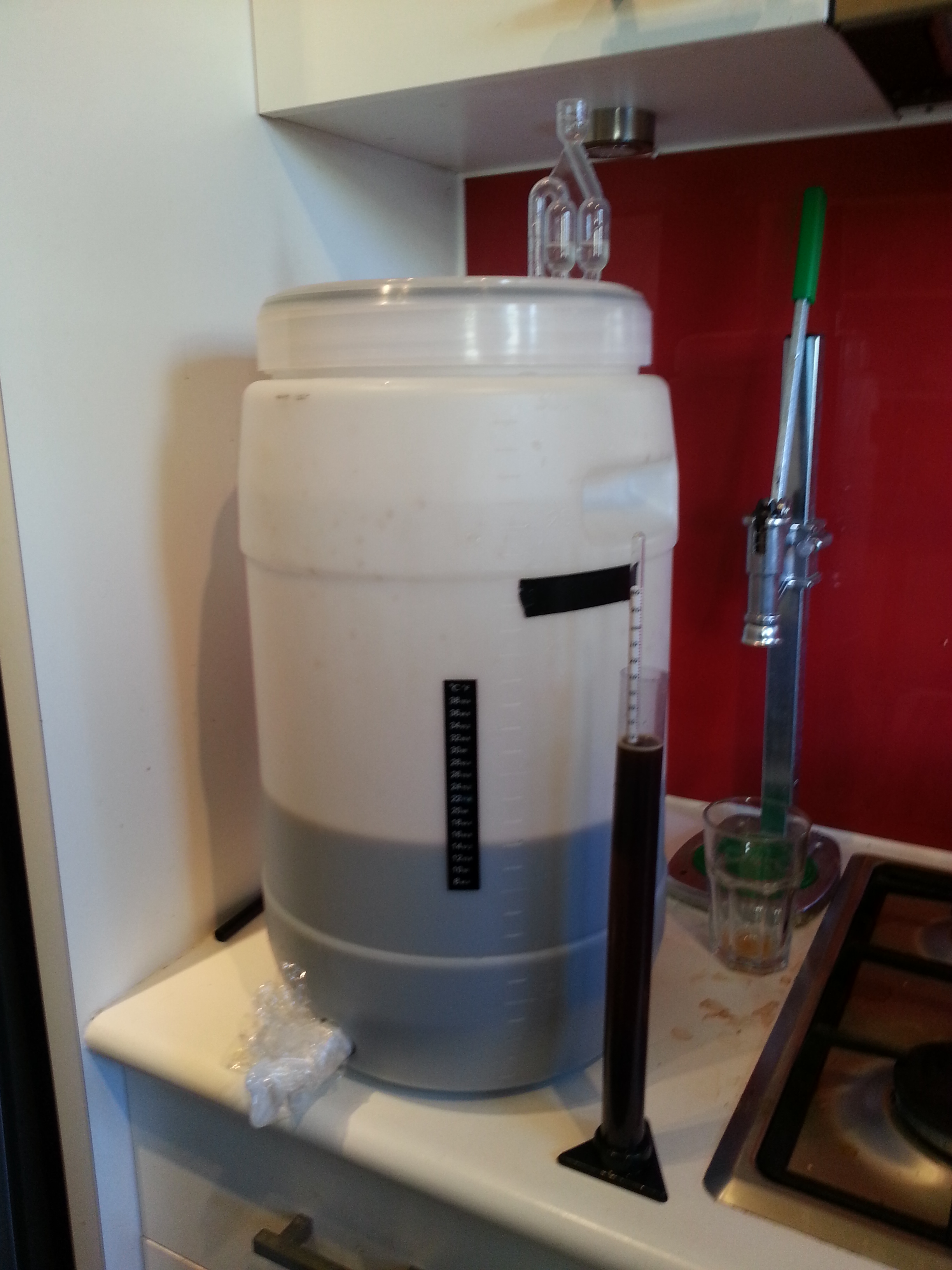 Anyway, we poured everything into the fermenter, topped it up to 12 litres, and took a quick break on the homebrew couch while we let things cool a little. The wort was about 27 degrees by the time we topped up the fermenter, but we wanted a few degrees lower.