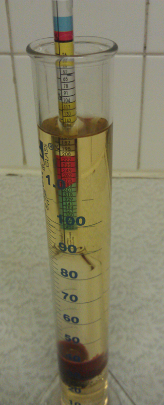 The wort from the stout took a while to chill. Over an hour even with a big chunk of ice direct into it to cool down. Then finally was ready to pour into the fermenter that had the Milk Porter, and the yeast left behind. A good shake up and done. All that was left was to get a gravity sample. This came out with a bit of froth. I left it for a bit to settle down. Then had to leave before it was clear.