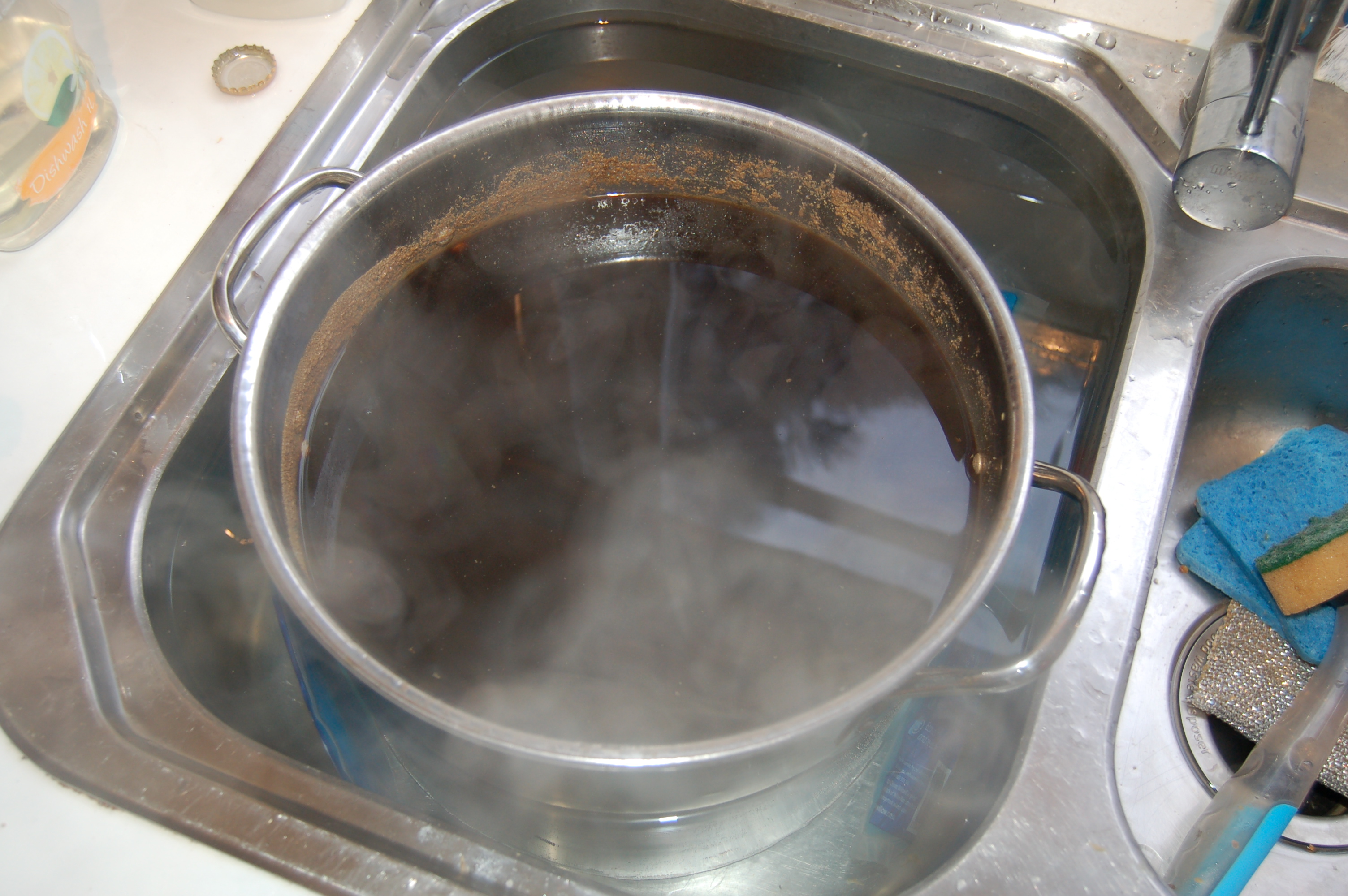 Pot was transferred to an ice bath. Some ice cubes went directly into the wort, water previously boiled before frozen. A second bath for the pot. Then into the fermenter. Added a little more sparged grain liquid, that might not have been the best idea as I’m not sure if that could have lead to contamination. Too late now! The liquid malt only went in at this stage, note that it wasn’t part of the boil. Not sure if that will make much difference. Let me know what you think with a comment below.